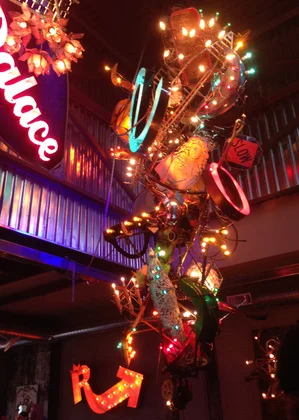 Made of lights, signs, tires and found objects, this giant chandelier will take some time to install...